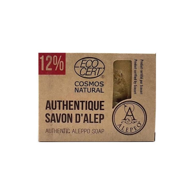 Jabón natural de alepo 12% certificado Eco Cert. Elaborado de forma natural. Se presenta en caja con ventana.